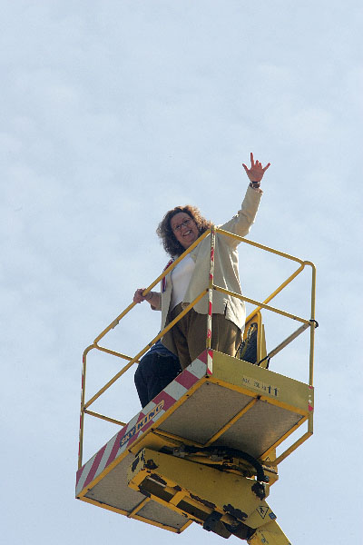 Organiser, Mitch de Faria, checks the view from the cherry picker