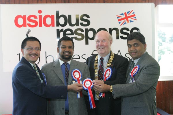 (L-R) Dr Pribadi Sutiono, Indonesian Embassy; Hon Sripathi Sooriyaarachchi, Deputy Minister of Sports & Youth Affairs, Sri Lanka; the Mayor of Winchester, Cllr Neil Baxter; Hon Lasentha Alagiyawanna, Deputy Minister of Transport, Sri Lanka © Picture Partnership High-resolution versions of this and other Picture Partnership images are available from www.picturepartnership.co.uk/asiabusresponse. |
